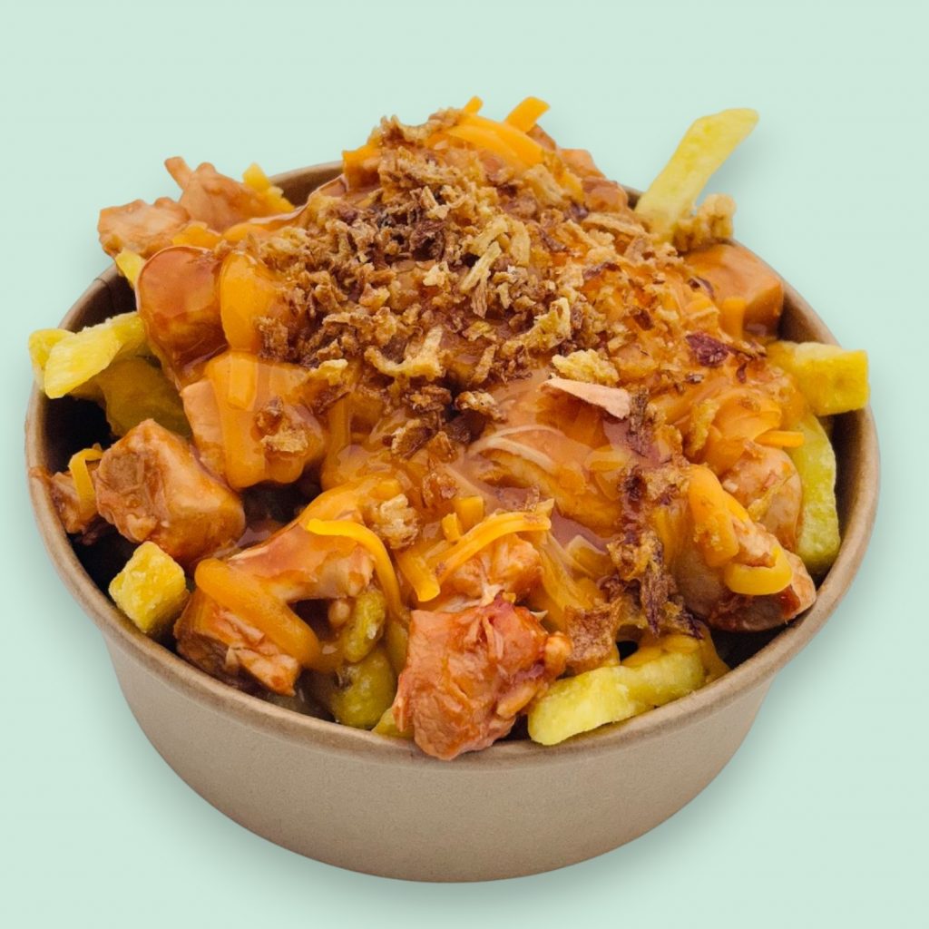 La version poulet reprend les ingrédients classiques de la poutine (frites fraiches croustillantes, cheddar et sauce gravy maison). On y ajoute de généreux morceaux de poulet revenus dans une marinade 100% gourmande !